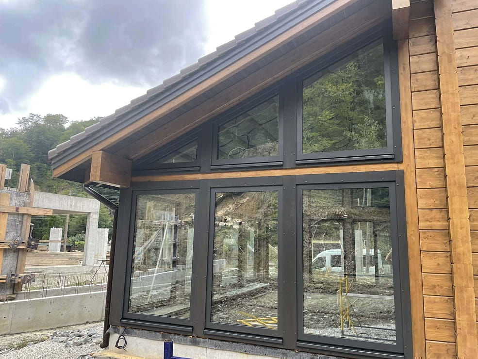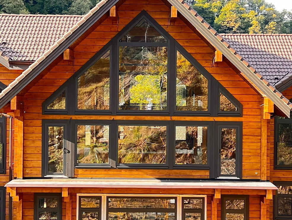 | Особенности | Деревянные откосы и наличники, французские балконы со светопрозрачными ограждениями, сдвижные двери |