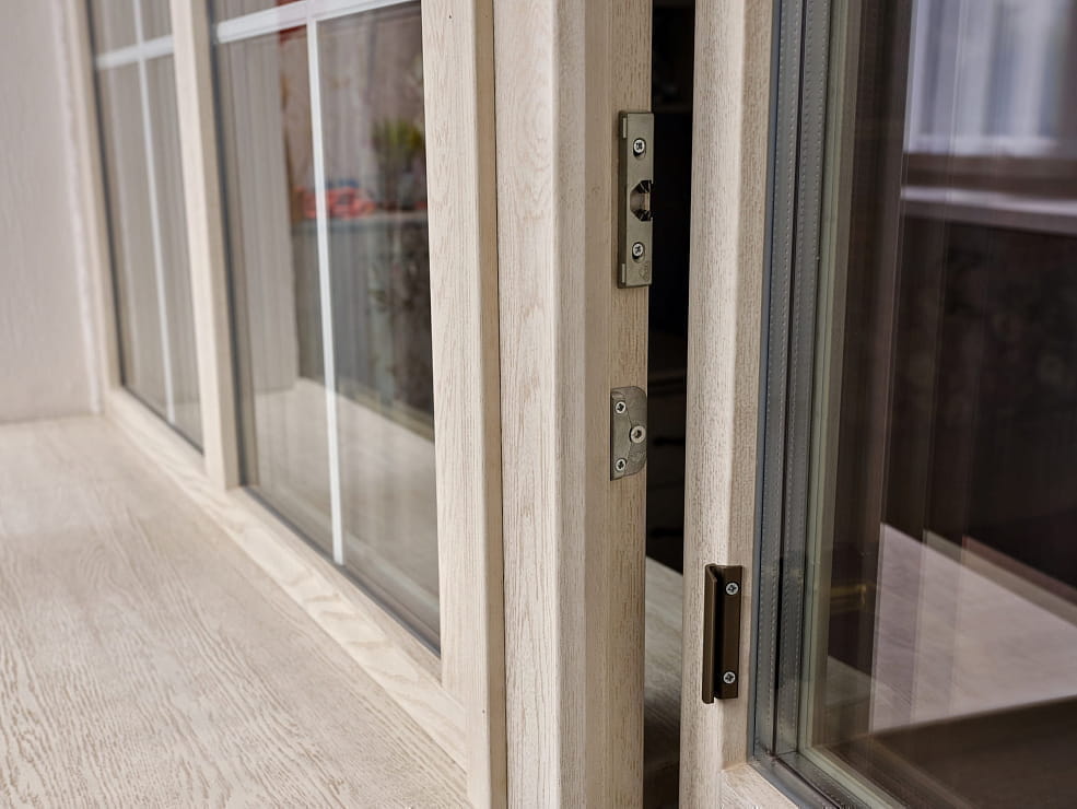 Стеклопакет Двухкамерный с двумя энергосберегающими стеклами и специальным стеклом ClimaGuard Solar Особенности: скрытые петли, ограничитель поворота 90, балконный блок с декоративными раскладками (шпросы шириной 18 мм)